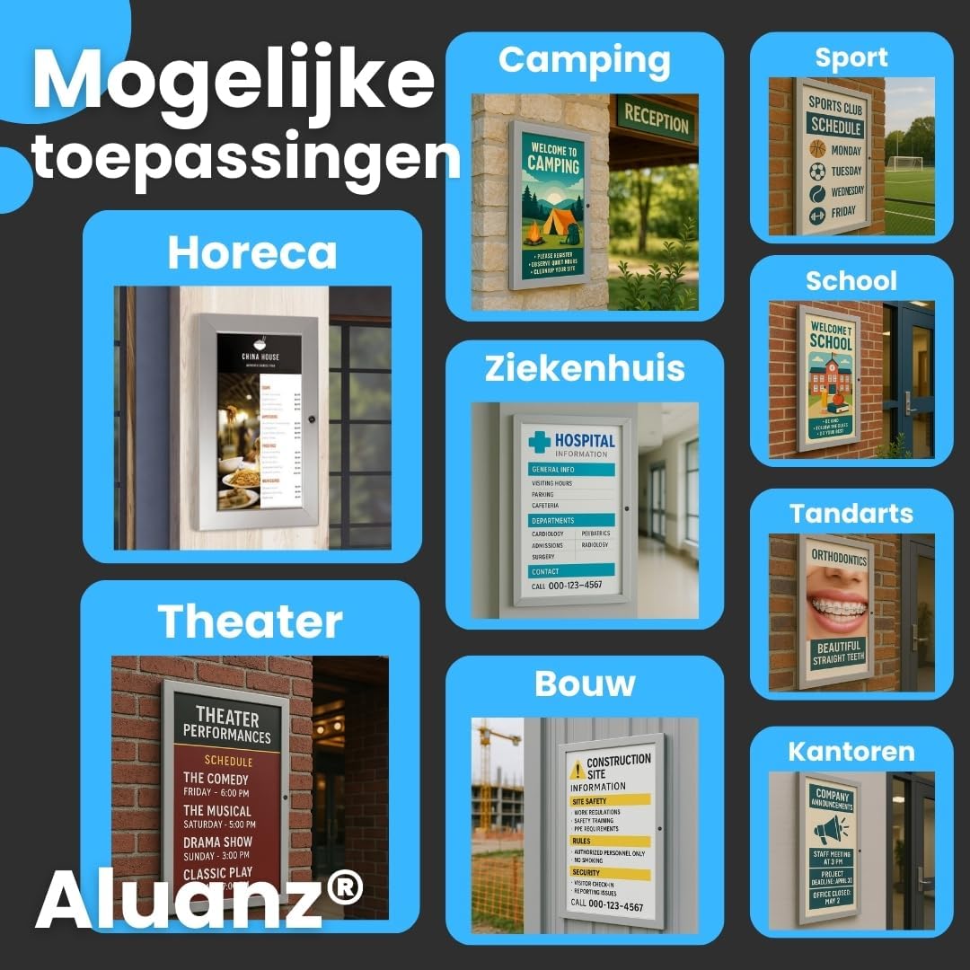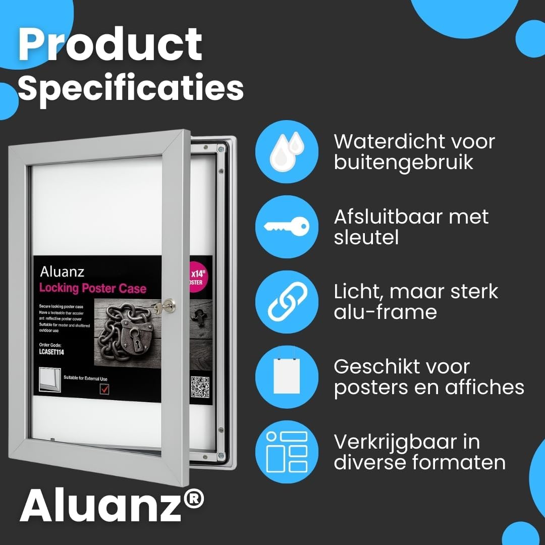 Deze robuuste aluminium postervitrine van het merk Aluanz beschermt uw posters tegen weersinvloeden, vuil en ongewenste verwijdering.