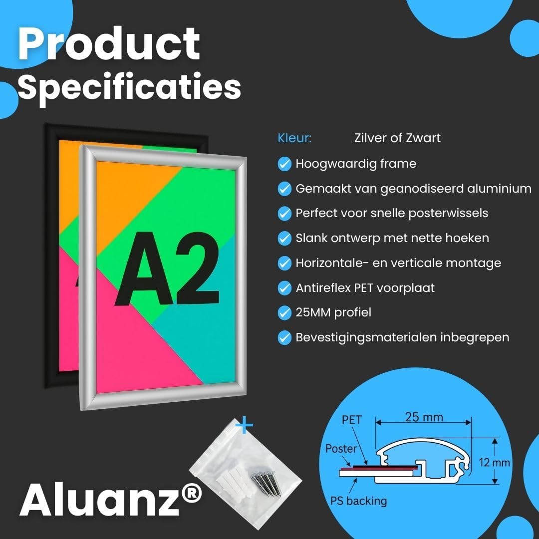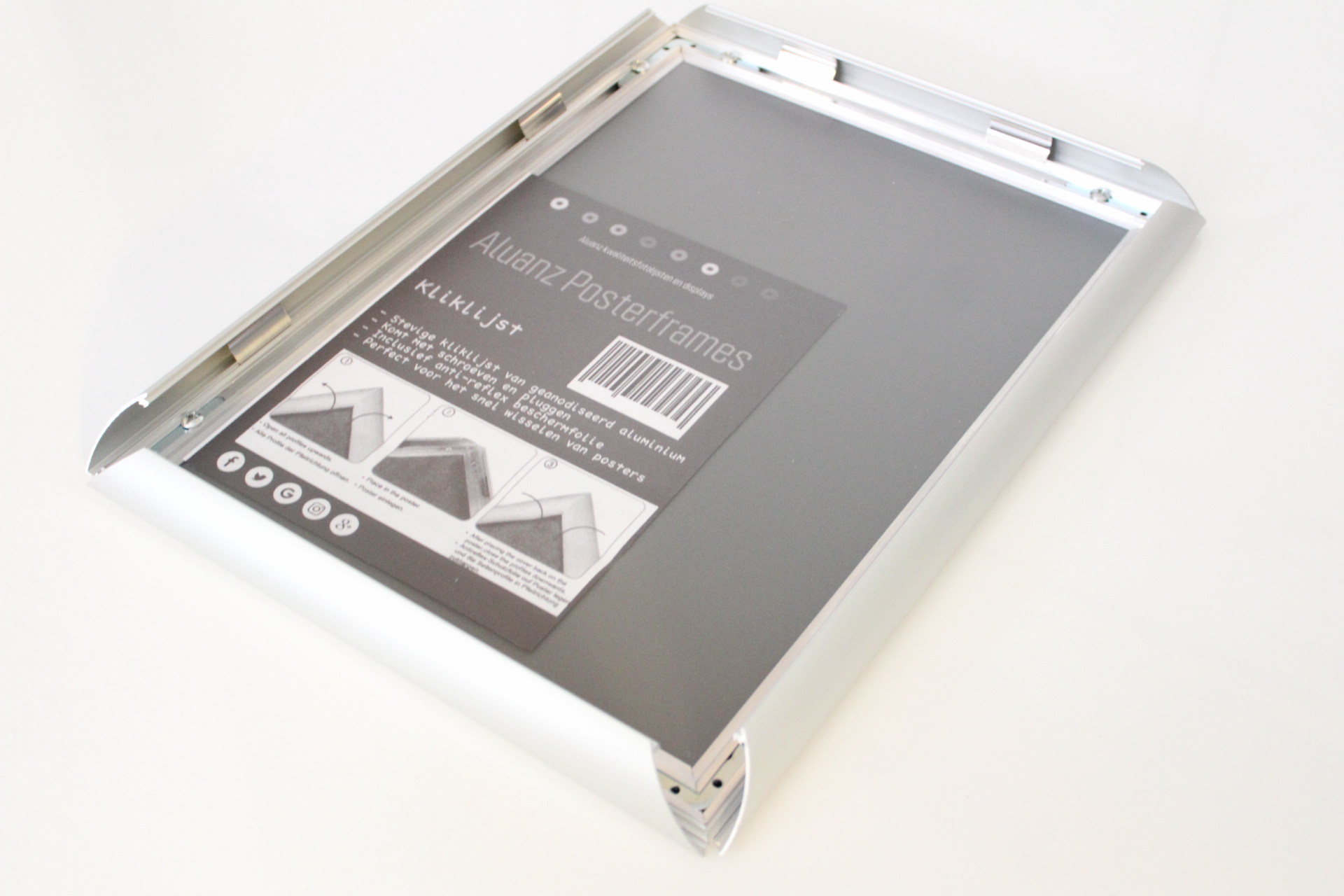 Professionele aluminium kliklijst van 25 mm in zilver geanodiseerd aluminium, geschikt voor posters en wisselcommunicatie in winkels, kantoren, horeca of gewoon in huis.
